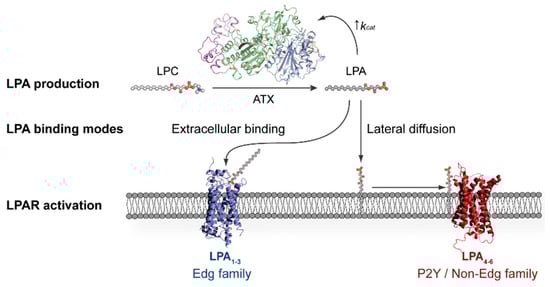 The LPA receptors are classified into distinct families: the endothelial cell differentiation gene (EDG) (LPA1–3) and non-EDG (LPA4–6) families. The crystallographic structures of LPA1 and LPA6 have provided the field with key mechanistic indications with respect to their ligand binding mode [,]. Namely, a structural comparison between the LPA1 and LPA6 substrate-binding sites has indicated contrasting LPA binding modes from the extracellular milieu or the plasma membrane, respectively. The former is consistent with a model by which LPA is carried by a lipid chaperone, such as albumin, to bind to the flexible N-terminal domain of LPA1 and deliver LPA specifically [], whereas the latter would not require lipid-carrying molecules [,].