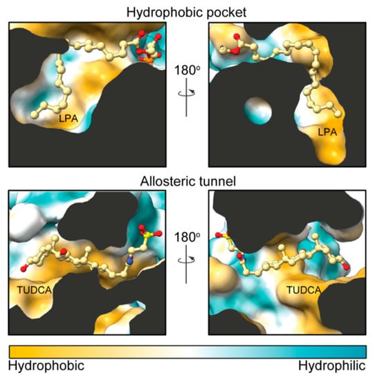 Hydrophobicity comparison between the pocket and the tunnel. Side sections of ATX (Protein Data Bank (PDB): 5dlw) showing the modes of binding of LPA and tauroursodeoxycholic acid (TUDCA) in the orthosteric and allosteric sites, respectively. The partly hydrophobic tunnel presents hydrophilic patches that accommodate the polar moieties of TUDCA. Protein surface was colored from orange to turquois using ChimeraX (version 0.91).
