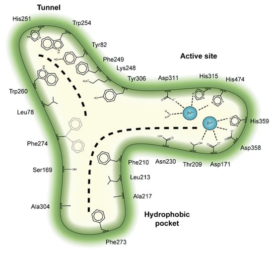 Structural studies have also established that ATX has a unique tripartite binding site. The catalytic bimetallic site is next to a hydrophilic shallow groove that accommodates the hydrophilic glycerol moiety of lipid substrates. This groove is connected by a T-junction to a hydrophobic pocket where acyl chains can bind, and a tunnel (often called the “hydrophobic channel”) that leads to the other side of the PDE domain []. It is noteworthy that the tunnel (or channel) is only partially hydrophobic in nature and has hydrophilic patches, unlike the pocket (Figure 2). The tunnel binds steroid molecules [], as well as the LPA product [,], which results in a modulation of catalytic efficiency. Thus, we refer to the tunnel as the allosteric site, while we refer to the substrate-binding, hydrophilic groove and the hydrophobic pocket, as the orthosteric site (Figure 3).