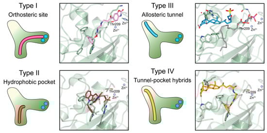 The tripartite ATX binding site represents a remarkable potential for selective design of inhibitors. Over time, ATX inhibitors of a distinct chemical nature were designed, including lipid-based inhibitors [], DNA aptamers [], as well as small molecules. The last group, the focus of this review, can be in turn classified in four distinct types (I, II, III and IV) depending on their mode of binding to the ATX tripartite site (Figure 4) [].