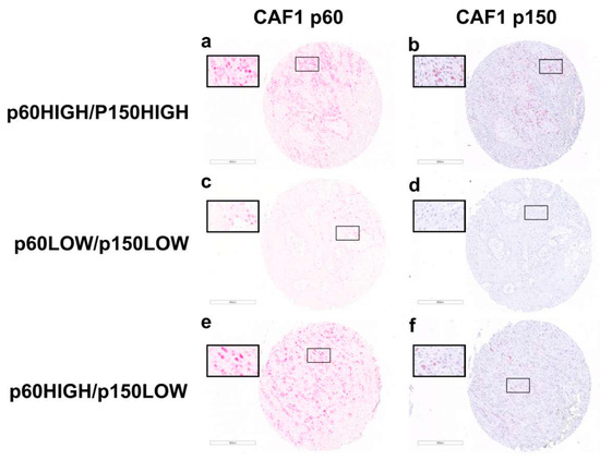 IHC staining of OSCC FFPE tumour samples with anti-CAF-1 p60 and anti-CAF-1 p150 antibodies. The figure shows representative images of anti-CAF-1 p60 and anti-CAF-1 p150 IHC staining intensity in OSCC FFPE tumour samples grouped according to cluster classification as resulted by cluster analysis of immunohistochemistry expression data: (a,b) p60 HIGH and p150 HIGH staining category, respectively; (c,d) p60 LOW and p150 LOW staining category, respectively; and (e,f) p60 HIGH and p150 LOW staining category, respectively. Magnification: for each panel, a 5× image of the entire core is shown and the inset shows the highlighted region.