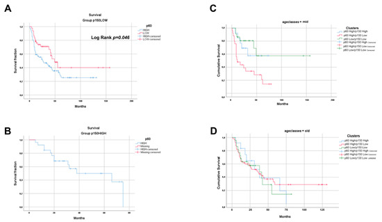 To further unravel the prognostic potential of p60 and p150 tissue expression in OSCC, we stratified the studied population by the age of patients at diagnosis, grouping the population in “young” (<40 years); “mid” (41–60 years); and “old” (>60 years). The survival data frequency distribution analysis, upon crossing the clusters by the overall survival results and the age groups, gave an extremely significant result in the mid-age population (p = 0.002). In the old age population, the distribution was not significant (p = 0.910), and the group of young age population was not big enough to allow statistical analysis (N = 5) (Table S2).