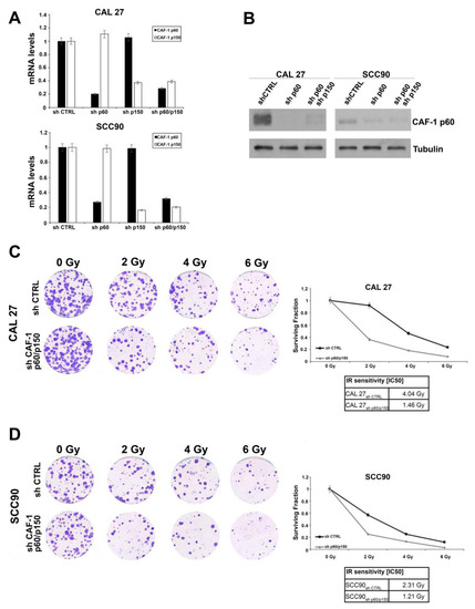 (A) Analysis of CAF-1 p60 and p150 relative mRNA expression by quantitative RT-PCR in human OSCC (CAL 27 HPV-negative) and OPSCC (SCC90 HPV-positive) cell lines, following stable trasnfection of the sh-CAF-1 p60, sh-CAF-1 p150 or both the sh-CAF1 p60/p150 vectors. (B) Immunoblot analysis of the CAF-1 p60 protein levels in OSCC- and OPSCC- derived cell lines. Anti-tubulin is shown as loading control. (C,D) (left) Clonogenic assay of CAL 27 and SCC90 cells after 0, 2, 4, and 6 Gy irradiation. Only colonies consisting of at least 30 cells were counted. (right) Clonogenic survival curve of CAL 27 and SCC90 cells. Error bars indicate the standard error mean. The sensitivity to ionizing radiation is expressed as IC50 (the value of radiation able to inhibit the cell growth of 50%).