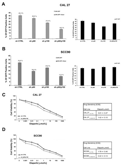 (A,B) Silencing of p60 and p150 suppresses homologous recombination. CAL 27 and SCC90 cells were transfected with DR-GFP alone, as control, or together with I-SceI. The percentage of GFP positive cells, compared to controls, is plotted on histograms representative of three independent experiments. Error bars indicate the standard error mean. (C,D) Silencing of p60 and p150 increases the sensitivity to Olaparib independently HPV-status. Survival fractions of CAL 27 and SCC90 cells treated with Olaparib, at the indicated doses, in presence (sh CTRL) or absence of CAF-1 (sh p60/p150) for 144 h. The sensitivity to the Olaparib was determined by the modified MTT assay (MTS), Cell Titer 96 AQueous One Solution assay, and expressed as IC50, i.e., 50% of the inhibitory concentration. The values are expressed as mean ± the standard deviation.