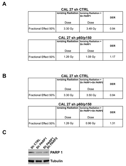 (A,B) The Dose Enhancement Ratio (DER) at 50% of the effect refers to the ratio between the dose with radiation alone and the dose with radiation + shPARP1 alone or in combination with shPARP2 for the same biological effect. If the DER is greater than one, then the silencing of PARP1/2 is functioning as a radiosensitizer. If the DER is less than one, the PARP silencing acts as a radioprotector. In the table are shown DER values at 50% effect for CAL 27 (sh CTRL vs. sh p60/p150). (C) The PARP1 depletion was assessed by Western blot. Tubulin is shown as loading control.