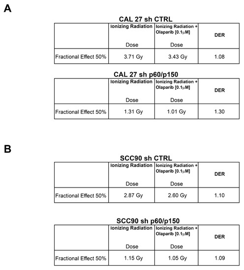 (A,B) The Dose Enhancement Ratio (DER) at 50% of the effect refers to the ratio between the dose with radiation alone and the dose with radiation + drug for the same biological effect. If the DER is greater than one, then the addition of the drug is functioning as a radiosensitizer. If the DER is less than one, the drug acts as a radioprotector. In the table are shown DER values at 50% effect for CAL 27 (sh CTRL vs. sh p60/p150) and SCC90 (sh CTRL vs. sh p60/p150).