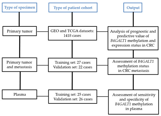 - Poeta, M.L.; Massi, E.; Parrella, P.; Pellegrini, P.; De Robertis, M.; Copetti, M.; Rabitti, C.; Perrone, G.; Muda, A.O.; Molinari, F. Aberrant promoter methylation of beta-1,4 galactosyltransferase 1 as potential cancer-specific biomarker of colorectal tumors. Genes Chromosomes Cancer 2012, 51, 1133–1143. [Google Scholar] [CrossRef] [PubMed]