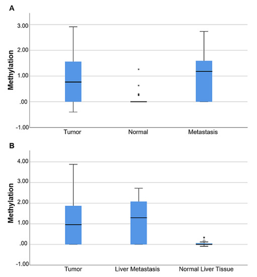 - Bhangu, J.S.; Beer, A.; Mittlbock, M.; Tamandl, D.; Pulverer, W.; Schonthaler, S.; Taghizadeh, H.; Stremitzer, S.; Kaczirek, K.; Gruenberger, T.; et al. Circulating Free Methylated Tumor DNA Markers for Sensitive Assessment of Tumor Burden and Early Response Monitoring in Patients Receiving Systemic Chemotherapy for Colorectal Cancer Liver Metastasis. Ann. Surg. 2018, 268, 894–902. [Google Scholar] [CrossRef]