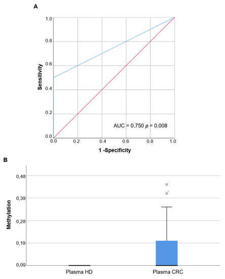 - Bergheim, J.; Semaan, A.; Gevensleben, H.; Groening, S.; Knoblich, A.; Dietrich, J.; Weber, J.; Kalff, J.C.; Bootz, F.; Kristiansen, G.; et al. Potential of quantitative SEPT9 and SHOX2 methylation in plasmatic circulating cell-free DNA as auxiliary staging parameter in colorectal cancer: A prospective observational cohort study. Br. J. Cancer 2018, 118, 1217–1228. [Google Scholar] [CrossRef]
