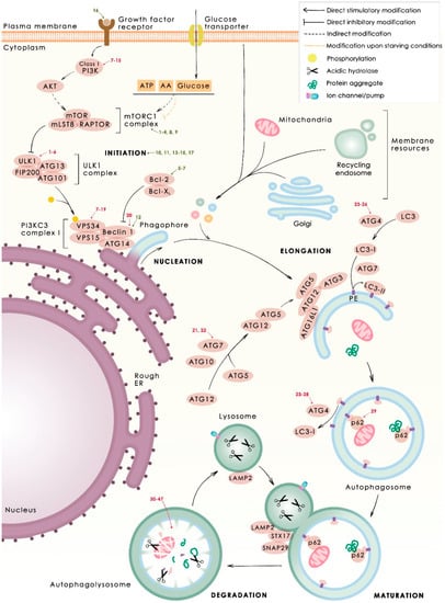 Mechanism of autophagy. The phases of the process of autophagy (nucleation, elongation, maturation, and degradation), with the main proteins that participate in each one, are depicted. Autophagy activators (green) and inhibitors (red) are marked where they interfere with the autophagy process. Numbers correspond to those compounds listed in Table 1 and Table 2, respectively.