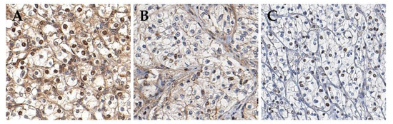 AMPK is an intracellular metabolic switch that increases catabolic processes upon activation by threonine (T172) phosphorylation; this phosphorylation is mediated by liver kinase B1 (LKB1) and is stimulated by an increased AMP:ATP ratio [7,8]. pAMPK has been highlighted for its roles as both a metabolic regulator and a tumor suppressor [7]. For example, the AMPK activator 5-aminoimidazole-4-carboxamide ribonucleotide (AICAR) has been shown to inhibit mTORC1 and thus negatively regulate proliferation and survival of multiple types of cancer cells, including ccRCC [7,9]. In agreement with these findings, increased AMPK/pAMPK expression is indicative of favorable survival in patients with carcinomas of the uterine cervix [10], ovary [11], and liver [12] whose tumor cells display cytoplasmic AMPK/pAMPK immunohistochemical (IHC) staining. Conversely, and paradoxically, nuclear pAMPK has been revealed to promote the survival, proliferation, and metastatic capacity of malignant cells under metabolic stress, likely through oncogene activation [13,14]. Recently, Liu et al. [14] demonstrated that nuclear pAMPK mediates the proliferation of glucose-deprived human renal cell carcinoma cells, by recruiting pyruvate kinase isozymes M2 and β-catenin. Although analysis from ccRCC tumor lysates revealed that increased AMPK mRNA and pAMPK are associated with favorable outcomes [1,6], the prognostic significance of pAMPK subcellular location has not yet been investigated in patients with ccRCC.