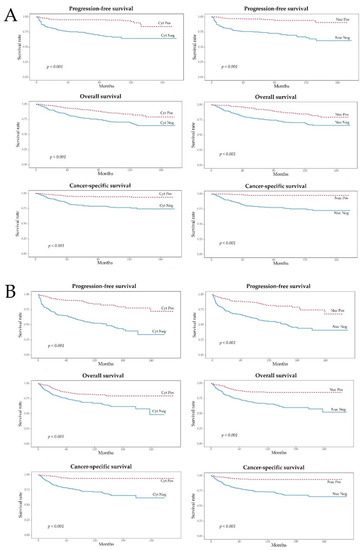 Survival analyses of pAMPK cytoplasmic and nuclear expression. (A) Discovery cohort; (B) Validation cohort. Cyt, cytoplasm; Pos, positive; Neg, negative; Nuc, nucleus.