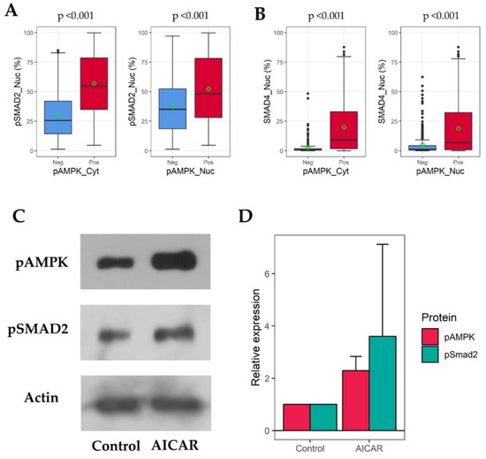 We compared nuclear pSMAD2 and SMAD4 immunoreactivity of pAMPK-positive and pAMPK-negative tumors. The mean (± standard deviation) pSMAD2 expression was 57.0% (±26.2) and 30.4% (±19.7) (p < 0.001) in the cytoplasmic pAMPK-positive and pAMPK-negative ccRCC samples, respectively, and 52.5% (± 28.5) and 37.5% (± 23.0) (p < 0.001) in the nuclear pAMPK-positive and pAMPK-negative ccRCC specimens, respectively. Similarly, SMAD4 nuclear expression was observed in 20.0% (±22.6) and 2.6% (±5.9) (p < 0.001) of tumor cells with cytoplasmic pAMPK positivity and negativity, respectively, and in 19.0% (±23.2) and 5.4% (±10.5) (p < 0.001) of those with positive and negative nuclear pAMPK immunostaining, respectively (Figure 3B). We next sought to determine whether pAMPK positively regulates SMAD protein expression. AICAR treatment activated pAMPK and increased pSMAD2 expression in Caki-1 cells (Figure 3C,D).