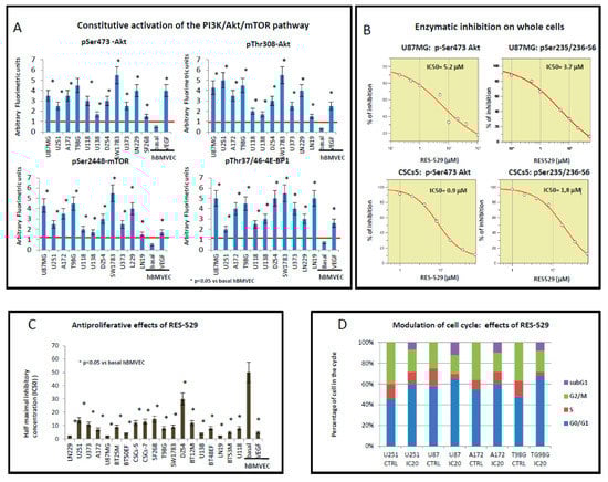 Constitutive activation and inhibitory activities of TORC1/TORC2 inhibitor (RES529) on phosphatidylinositol 3-kinase (PI3K)/Akt/mTOR in 11 glioblastoma multiforme (GBM) cell lines present in our cell cohort (is lacking the sole SF268 cell line which was not examined). Analyses was performed in whole cell lines cultured in 96-well microplates at 20,000 cells/wells. Untreated human brain microvascular endothelial (hBMVEC) cells were used as negative controls whereas vascular endothelial growth factor (VEGF) triggered hBMVEC were used as positive controls. (A) ELISA determination was assessed by using p-Ser473 Akt, p-Thr308 Akt, p-Ser2448 mTOR, and p-Ser 37/46 4E-BP1 antibodies on 11 GBM cell lines of our cell line cohort. Assays were performed in triplicate in a semi-quantitative manner by using arbitrary fluorimetric units. A red line indicates the cutoff of ELISA. Statistics: * p < 0.05 for the comparison between basal hBMVEC cells (negative control) and VEGF-treated cells (positive control) for all enzymatic activities. Next, GBM cell lines were compared with untreated (−VEGF) hBMVEC. These cells showed significant higher enzymatic activities compared to untreated hBMVEC (* p < 0.05). * p < 0.05 was added to indicate the statistically higher enzymatic values in the GBM cell lines compared to untreated (VEGF) hBMVEC. (B) Enzymatic inhibition by RES529 was evaluated by ELISA in U87MG and CSCs-5 cells measured through the decrease of p-Ser473 Akt and pSer235/23-S6 expression levels versus basal levels as percentage of inhibition in U87MG and CSCs5 cells. Assays were performed in triplicate. (C) Antiproliferative effects of RES529 on established glioblastoma cell lines and patient derived Glioma Initiating cells (GICs) with IC50 values evaluated in 13 GBM cell lines and seven GICs. In order to verify if normal endothelial cells were sensitive to RES529, we used the hBMVEC untreated or stimulated with VEGF (10 ng/mL). (D) Cell cycle phase distribution in U87MG, U251, A172, and T98G. Comparison between untreated cells and cultures treated with RES529 at relative IC20 value.