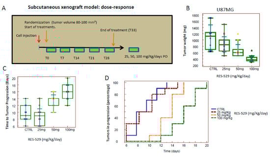 In vivo experiments: RES529 inhibition of tumor growth of U87MG cells subcutaneously injected in female nu/nu mice (xenograft model). Each group is represented by five mice with two tumors in the flank. (A) Schematic protocol for the dose-dependent experiment with doses of 25, 50, and 100 mg/kg/day, (B) tumor weight analyzed at the end of treatments. (C) Time to Progression (TTP, days) and (D) percentage of mice in progression plotted for the time (Kaplan-Meyer curves) for the U87MG cell model. Statistical analyses are shown in Figure S2A–C.