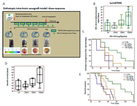 In vivo experiments: RES529 modified tumor growth of luciferase transfected U87MG cells orthotopically injected in the brain of female nu/nu mice. Ten mice per group with two tumors each were evaluated. (A) Schematic protocol for the dose-dependent experiment with doses of 25, 50, and 100 mg/kg/day. (B) Disease-free survival values. (C) Percentage of mice in progression plotted for time (Kaplan-Meyer curves). (D) Overall survival values. (E) Percentage of dead mice in time (Kaplan-Meyer analysis). Statistical analyses are shown in Figure S5A–D.