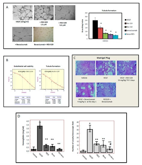 Anti-angiogenetic effects of RES529 in combination with bevacizumab (Beva). (A) Tubule formation of hBMVECs cultured with VEGF 10 ng/mL with added RES at 1.0 and 5.0 μM, bevacizumab, or combination RES529 (1.0 μM) and bevacizumab (qualitative images and branching index analysis). Magnification 50×. (B) IC50 values calculated for the anti-proliferative effects (5.02 ± 1.53 μM) of RES529 on endothelial cells and tubule formation (IC50 (mM) = 8.23 ± 3.37). (C) Matrigel plugs, containing saline (vehicle) or VEGF 10 ng/mL, harvested in animals untreated or treated with 50 mg/kg/day (one week), bevacizumab 4 mg/kg/day (one administration at day 1) or combination. (D) Analyses of vessel count per microscopic field at 20× and hemoglobin content. For each assay, n = 5 (five replicates). Data were presented as mean ± standard deviation (SD). Statistics: (A) * p < 0.05 for comparison VEGF versus CTRL; (D) * p < 0.05 for comparison between VEGF and CTRL; ** p < 0.05 for the comparison between VEGF and RES529 (RES), bevacizumab (Beva) and RES + Beva; finally # p < 0.05 for the comparison between RES and RES + Beva. Experiments in this figure were repeated three times, and each time the similar results were obtained.