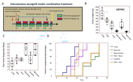 In vivo experiments: RES529 modified tumor growth of U87MGcells subcutaneously injected in female nu/nu mice (xenograft model). Each group is represented by five mice with two tumors in the flank. (A) Schematic protocol for the combination experiment (Table 1) with 50 mg RES529 and/or BEVA (4 mg/kg iv every four days) or sunitinib (40 mg/kg per overall survival (OS)); (B) tumor weight analyzed at the end of treatments. (C) Time to Progression (TTP, days). (D) Kaplan Meier curves generated for percentage of tumors in progression Statistical analyses are shown in Figure S7A–C.
