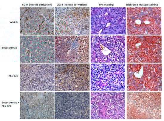Next, we analyzed the morphological changes after the association of RES529 (50 mg/kg os qd) and bevacizumab (4 mg/kg iv every 14 days) on mice xenografts mainly to assess modification in vessel network and vasculogenic mimicry (VM). It has been widely demonstrated that after an initial antitumor effect, which “normalize” the angiogenetic network, bevacizumab induced the triggering of protective pathways able to modulate the vasculogenesis which takes place to angiogenesis. Usually elevated angiogenesis and vasculogenesis may be observed in untreated tumors for the presence of CD34 positive cells which react with murine isotype (angiogenesis) or with the human isotype (human tumor vasculo-mimetic cells). In Figure 6, we show human CD34+ cells are expressed in tissues derived from untreated tumors (vehicle) as single dispersed cells commonly not associated with organized vessels, however, murine CD34+ cells form vascular structures in the tumor parenchyma. Periodic acid-schiff (PAS) staining on xenograft histological specimens showed that angiogenesis and vasculogenic mimicry are equally distributed in untreated U87MG xenografts. Furthermore, we show that the structure of the entire vessel was straightened by a dense PAS positive connective matrix. In the “vasculo-mimetic” region of the wall, a series of small vascular lacunae (micro-capillaries were also present). The number of these structures is considerably higher in these PAS positive enclosed area compared to those formed in the “angiogenic” portion of the tumor. Histological slides from bevacizumab-treated animals, showed a significant reduction of murine CD34 positive vessels. As previously demonstrated [,], bevacizumab induced vasculomimicry associated with murine endothelial cells death and proliferation of human CD34 positive cells with envelope preformed vessel structures.