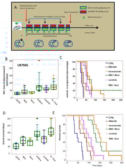 In vivo experiments: RES529 inhibition of tumor growth of luciferase transfected U87MG cells orthotopically injected in the brain of female nu/nu mice. Each experimental group included 10 animals. (A) Schematic protocol for the dose-dependent experiment with doses with 50 mg/kg/day RES529 and/or BEVA (4 mg/kg iv every four days) or sunitinib (40 mg/kg per OS). (B) Disease-free survival (DFS) values. (C) Percentage of mice in progression plotted for time (Kaplan-Meyer curves). (D) Overall survival (OS) values. (E) Percentage of dead mice in time (Kaplan-Meyer curves). Statistical analyses are shown in Figure S9A–C.