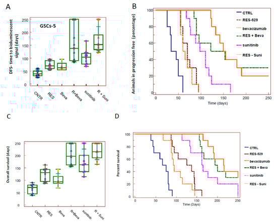 Female CD1 nu/nu mice were inoculated intra-cerebrally as previously described [,,] by using luciferase transfected U87MG and GSCs-5. Five days after injection, when no luciferase activity was intracranially detectable, animals were randomized on 10 mice/group. In a first experiment type, we divided animals into four groups (Table 1): (1) Control (vehicle); (2) RES529 (25 mg/kg/5 day/week, PO); (3) RES529 (50 mg/kg/5 day/week, PO); (4) RES529 (100 mg/kg/5 day/week, PO). Next, the dose of 100 mg/kg of RES529 was tested in combination with bevacizumab or sunitinib: Sixty mice were randomly divided into six groups as described above (ten mice per group, Table 1): (1) Control (vehicle); (2) bevacizumab (BEV) 4 mg/kg PO every 14 days; (3) RES529 (100 mg/kg/5 day/week, PO); (4) BEV plus RES529; (5) sunitinib (SUNI, 40 mg/kg PO qd); (6) SUNI plus RES529 in vivo bioluminescence images were obtained using the UVITEC Cambridge Mini HD6 (UVItec Limited, Cambridge, UK). Animals were anesthetized and luciferin (150 mg/kg) was injected intra-peritoneally 15 min prior to imaging. Images were collected and bioluminescence intensity (BLI) was measured. To simulate pathological condition at the time for which surgery occurs (low number of tumor cells in wound bed causing regrowth recurrence), we inoculated a small number of cells (3 × 103) and started drug administration when no bioluminescence was detected. Mice were euthanized when they displayed neurological signs or weight loss of 20% or greater to record data on overall survival (OS).