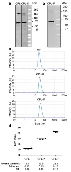 Analysis of CPL, CPL-K and CPL-F. (a,b) SDS-Page analysis of CPL, CPL-K (a), and CPL-F (b). The respective molecules are in the range of the estimated sizes of 59 kDa (CPL), 61 kDa (CPL-K) and 62 kDa (CPL-F). (c) Dynamic light-scattering (DLS) measurement of CPL, CPL-K and CPL-F. Measurements were performed three times independently for each of six samples per construct. (d) Mean particle sizes detected by DLS in the six samples per construct. Pd, polydispersion; SD, standard deviation.