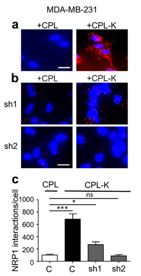 CPL-K interacts with Neuropilin-1 (NRP1) in MDA-MB-231 cells. (a,b) Proximity ligation assays (PLA) with MDA-MB-231 cells treated either with 1 µM CPL or 1 µM CPL-K and using antibodies against the cellular NRP1 protein together with antibodies against the MBP part of CPL and CPL-K. NRP1 forms complexes with CPL-K (red fluorescent dots) but not with the CPL control protein. NRP1/CPL-K complexes are formed in normal cells (a) but not in cells of two different cells lines in which NRP1 expression is knocked down (sh1, sh2) (b). Scale bar, 10 µm. (c) Quantification of NRP1/CPL or NRP1/CPL-K interactions (fluorescent dots per cell) in cell lines expressing shRNA constructs or not (C = control). N = 3 experiments, 5 to 10 imaging fields were quantified per condition and replicate experiment. * p < 0.05; *** p < 0.0005, ns > 0.05 (non-parametric analysis of variance (ANOVA) test followed by Dunn’s multiple comparison test).