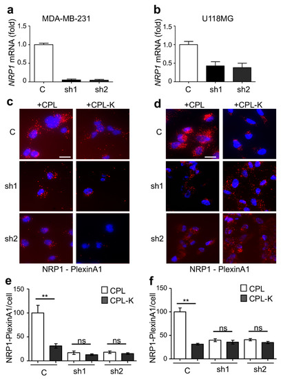 We investigated whether CPL-K binds to NRP1 in living cells with a fluorescent proximity ligation assay (PLA) applied to cultured MDA-MB231 cells that naturally express NRP1. We used specific antibodies binding to MBP and NRP1, respectively, to reveal the interaction between the recombinant protein and the target receptor. According to the atomic model of CP [22], the N- and C-termini of the CP are very close together. Thus, the N-terminally fused MBP is an excellent reporter for the interaction of the C-terminally fused MTP-NRP1 with NRP1-containing receptor complexes in the membrane of target cells. As shown in Figure 2a, only a few fluorescent spots corresponding to non-specific binding were detected when 1 µM CPL was added to the cells. However, numerous spots were counted when MDA-MB231 cells were treated with 1 µM recombinant CPL-K protein, thus reflecting the high capacity of CPL-K to bind NRP1. The specificity of the interaction was assessed in two independent shRNA-expressing MDA-MB231 cell lines in which NRP1 was silenced. Indeed, both cell lines (sh1 and sh2) showed a significantly lower number of spots, suggesting that the amplification signal (red dot) is generated when CPL-K interacts with NRP1 (Figure 2b,c). To further demonstrate the interaction of CPL-K with NRP1, we investigated whether CPL-K can inhibit the dimerization of NRP1 with PlexinA1. Therefore, we determined the number of NRP1/Plexin-A1 dimers at the surface of the wild-type (WT) cells and in cells knocked down for NRP1. This assay was performed with cells of the glioblastoma U-118MG cell line previously shown to express NRP1 and Plexin-A1 [54], cells of the metastatic breast cancer cell line MDA-MB231, and cells with a knockdown of NRP1 expression that was confirmed by reverse transcription followed by quantitative polymerase chain reaction (RT-qPCR) analysis in both cell lines (Figure 3a,b). Using the PLA with NRP1 and PlexinA1 antibodies, numerous fluorescent spots were obtained when MDA-MB231 and U-118MG cells were incubated with CPL, thus demonstrating that the high level of NRP1/PlexinA1 dimers is not altered by CPL. Incubation of the cells with CPL-K, however, significantly reduced the number of spots, thereby demonstrating the disruption of NRP1/Plexin-A1 dimers in both cell types. As expected, cells of the respective NRP1 knockdown lines showed only a low number of spots also in the presence of CPL, confirming the specific detection of NRP1/Plexin-A1 dimers and their disruption by CPL-K. Quantification of the spots revealed that CPL-K disrupted the NRP1/Plexin-A1 dimers in the WT cells to the level observed in the NRP1-silenced cells. Taken together, these observations indicate the capacity of CPL-K to bind NRP1 and to interfere with the dimerization function of NRP1.