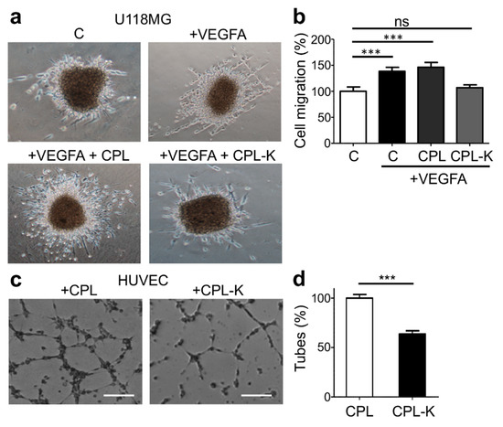 We previously showed that the disruption of the NRP1/Plexin-A1 dimer suppresses vascular endothelial growth factor type A (VEGFA)-induced migration of glioblastoma U-118MG cells [54]. To determine whether the CPL-K-induced disruption of NRP1/Plexin-A1 dimers produces similar effects on cell migration, we performed a 3D migration assay. Therefore, U-118MG cell aggregates were grown in plasma clots in the presence or absence of VEGF and in the presence of CPL or CPL-K. As is shown in Figure 4a,b, VEGFA increased cell migration in comparison to medium alone, as demonstrated by the more pronounced total surface occupied by migrating cells around the border of the aggregates after 24 h. Notably, in the presence of CPL-K, VEGFA-induced migration was reduced to levels as seen without VEGFA, which was not the case in the presence of CPL. The disruption of the NRP1/Plexin-A1 complex was previously also shown to inhibit human umbilical vein endothelial cell (HUVEC) tube formation on Matrigel [54]. Interestingly, HUVEC Matrigel tubulogenesis assays showed that CPL-K, but not CPL, has the same effect (Figure 4c,d). Altogether, these results demonstrate that CPL-K inhibits VEGFA-induced migration and HUVEC tubulogenesis. Importantly, the reduction of HUVEC tubulogenesis by 37% indicates that the anti-angiogenic activity of CPL-K is similar to that of free MTP-NRP1, which was shown to inhibit tubulogenesis by 30 % [47].