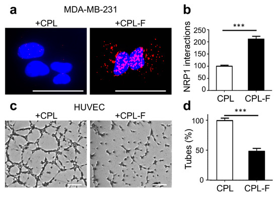 CPL-F interacts with NRP1. (a,b) Phenotype (a) and quantification (b) of interaction of CPL and CPL-F in MDA MB231 cells as determined by PLA with antibodies against NRP1 and MBP. Scale bar, 10 µm. Quantification of NRP1/CPL and NRP1/CPL-K complexes per cell. N = 3 independent experiments with 5–10 imaging fields analyzed per condition. *** p < 0.0001 Mann-Whitney test. (c,d) Phenotype (c) and quantification (d) of tube formation of HUVECs four hours after treatment with CPL or CPL-F. Scale bar, 200 μm. Note a 52% decrease in the formation of tubes with CPL-F. N = 4 experiments. *** p < 0.0001 (Mann–Whitney test).