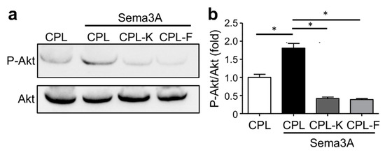 As Sema3A binds and activates NRP1, we investigated whether CPL-F and CPL-K affected the phosphorylation of Akt (P-Akt), which is an indicator of downstream signaling [55]. By detection of P-Akt with specific antibodies in Sema3A-stimulated MDA-MB-231 cells, we found that Sema3A stimulated the phosphorylation of Akt in the presence of CPL but not in the presence of CPL-K and the CPL-F (Figure 6). Thus, unlike CPL, CPL-K and CPL-F inhibit the ability of Sema3A to stimulate the Nrp1 signal transduction pathway leading to Akt phosphorylation.