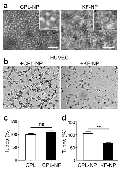 Characterization of monotype and mixed CPL nanoparticles by transmission electron microscopy (TEM) and effect on angiogenesis. (a) TEM images of nanoparticle assemblies (disks) derived from CPL and from a mixture of CPL, CPL-K, and CPL-F (KF). Scale bar, 100 nm; scale bar in insert figures, 25 nm; (c,d) Phenotype (b) and quantification (c,d) of the tubule formation by HUVECs in matrigel. The number of tubes per field was measured four hours after cell plating and upon addition of the different CPL assembly formulations. N = 3 experiments, five wells quantified per condition for each experiment. Scale bar, 200 μm. Note that CPL and CPL-NP do not inhibit tube formation. In contrast, particles made of the mixture of CPL, CPL-K and CPL-F (KF-NP) significantly reduce tube formation. N = 3 experiments. ns > 0.01; ** p < 0.001 (Mann–Whitney test).