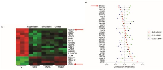 GLS2 is inversely correlated with epithelial to mesenchymal transition (EMT) in breast cancer patients. (A) Heatmap of mRNA expression of metabolism-associated genes obtained from a previously reported analysis [26] of HMLE cells treated with vector only (V) and in HMLE cells that express GSC, Snail, or Twist. GLS2 and GLS are indicated by arrows. (B) Plots of correlation between GLS and GLS2 (red circles), GLS and an EMT gene signature (green circles), and GLS2 and an EMT signature (blue circles) in difference cancer types. The breast cancer tumor (BRCA) relationship is indicated by the arrow.