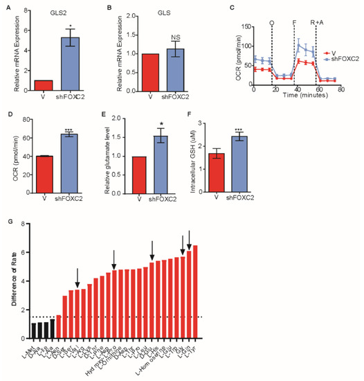 Inhibition of FOXC2 enhances GLS2 expression and glutamine utilization. (A,B) RT-PCR analysis of A) GLS2 mRNA and B) GLS mRNA in HMLER cells that express Snail without (−) or with (+shFOXC2) expression of shFOXC2. (C) OCR of HMLER cells that express Snail without (−, n = 6) or with (+shFOXC2, n = 6) shFOXC2 over time (in minutes) after addition of oligomycin (O), FCCP (F), and rotenone and antimycin (R + A). (D) Basal respiration rate (pmol/min) of HMLER cells that express Snail without (−, n = 6) or with (+shFOXC2, n = 6) shFOXC2. (E) Quantification of intracellular glutamate per 1 × 103 HMLER cells that express Snail without (−, n = 3) or with (+shFOXC2, n = 3) shFOXC2. (F) Quantification of intracellular GSH in HMLER cells that express Snail without (−, n = 4) or with (+ shFOXC2, n = 5) shFOXC2. (G) Difference in utilization between HMLER cells that express Snail without (−, n = 3) or with (+shFOXC2, n = 3) shFOXC2 at 8 h. Negative values indicate metabolic loss. Positive values indicate metabolic gain. Dotted lines at −1.5 and 1.5 are designated cutoffs to indicate significance in loss (green bars) and gain (red bars). Black arrows point out the amino acids restored from Figure 2A. Plotted are means ± SD; * p ≤ 0.05, *** p ≤ 0.001, NS indicates p > 0.05.