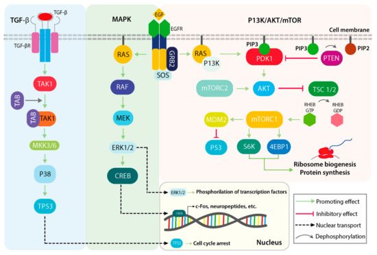 Complementary signaling pathways display similar architecture to the MAPK pathways, in the form that all initiate post interaction with an extracellular stimulus (either GFs or cytokines) and converge in nuclear translocation of specific factors that promote gene expression. With regard to the regulatory activity of the MAPK pathway, other relevant pathways are P13k/AKT/mTOR (phosphoinositide-3-kinase/v-akt murine thymoma viral oncogene homolog 1/mechanistic target of rapamycin kinase) and TGFβ (transforming growth factor beta) signaling, both of which display varying degrees of interaction and cumulative signal transduction [8]. The nuclear translocation of MAPK signaling constituents may be considered as a significant regulatory system of key cellular processes, representing a possible therapeutic intervention [8].