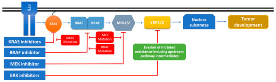 Mitogen-activated protein kinase (MAPK) inhibitor efficiency based on mutational status—cause of resistance and weak spots. Treatment resistance is a reoccurring problem in the case of MAPK pathway inhibitors. The post-treatment acquirement or selection of tumor cells with new mutations renders the treatment useless. In the case of KRAS, BRAF, and MEK inhibitors, mutations in any of these two components can determine therapeutic resistance and relapse. Targeting ERK can become a true Achilles heel in treating cancers with MAPK signaling alterations, as ERK inhibitors target specifically downstream of the signaling cascade, with no regard of the mutational status of the upstream components (e.g., KRAS and BRAF) (KRAS: Kirsten rat sarcoma viral oncogene homolog; BRAF: B-Raf proto-oncogene serine/threonine kinase; ERK:extracellular regulated MAP kinase).