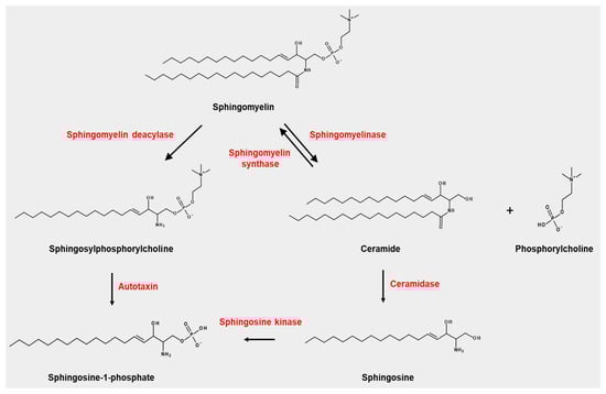 Sphingosylphosphorylcholine (SPC) is produced from sphingomyelin by sphingomyelin deacylase. Autotaxin can degrade SPC into sphingosine-1-phosphate, which is also produced from sphingosine by sphingosine kinase. Sphingomyelin is also degraded by sphingomyelinase into phosphorylcholine and ceramide, which is converted into sphingosine by ceramidase. Ceramide is converted into sphingomyelin by sphingomyelin synthase.