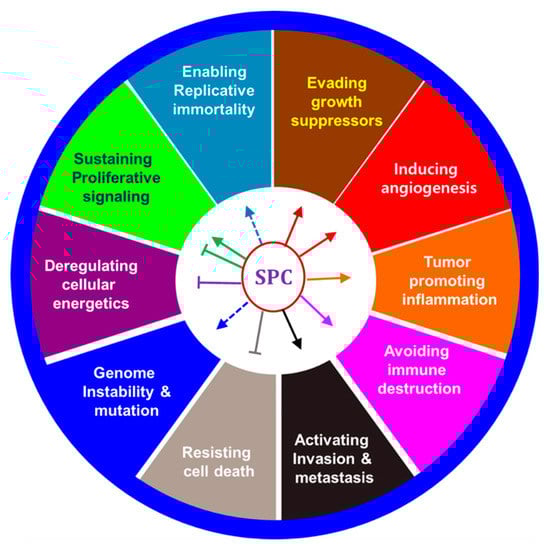 SPC has been studied in several cancers and appears to inhibit or promote proliferation depending on various concentrations. Also, SPC can act as an inflammatory or anti-inflammatory factor, and it contributes to angiogenesis because of its vascular effects. Therefore, SPC effects were described in terms of ten cancer hallmarks (Figure 2), and the effects of SPC on neuronal elements in cancer progression, which are now being actively studied, are also discussed.