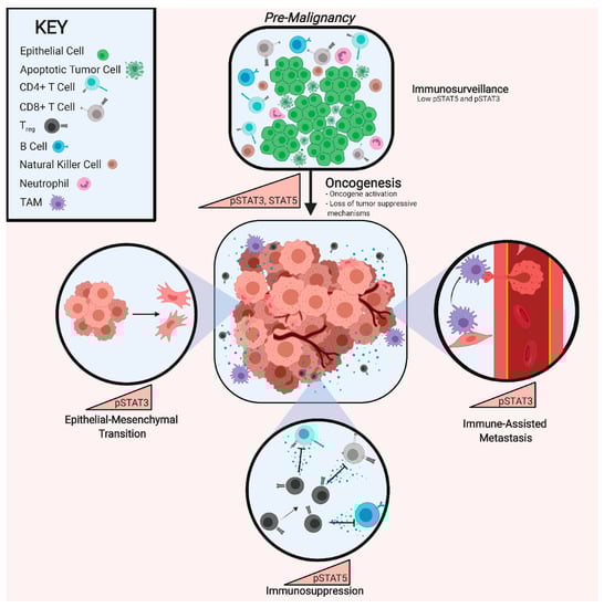 Biological Impact of STAT3 and STAT5 Activation. Pre-malignant cell populations, in which apoptotic signaling and immunosurveillance are functional, exhibit low levels of phosphorylated STAT3 (pSTAT3) and STAT5 (pSTAT5). Elevated activity of pSTAT3 and/or pSTAT5 accompanies tumorigenesis, leading to the inhibition of apoptotic pathways and repression of immune cell recognition of a burgeoning tumor. pSTAT3 is utilized by malignant cell populations to drive epithelial-mesenchymal transition (EMT) and by tumor-associated macrophages (TAMs) and tumor-associated neutrophils (TANs) to drive metastasis. pSTAT5 activity in progenitor T-cells drives expansion of a Treg population that then secretes factors that inhibit the function of CD4+ and CD8+ T-cells as well as B-cells.