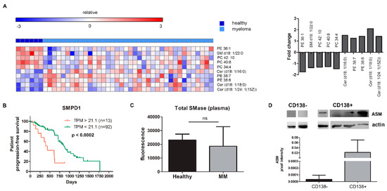 MM patients contain increased levels of ceramides and decreased levels of sphingomyelin. (A) Lipidomics analysis showing differences in plasma samples of healthy volunteers (n = 6) and multiple myeloma patients (n = 38) such as an increase of Cer16:0, Cer18:0, and Cer 24:1(15Z) and a decrease of SM 22:0. FDR adjusted p < 0.05 for fold changes. (B) Kaplan–Meier curve for progression-free survival (PFS) after MaxStat analysis of SMPD1 expression in MM patients (MMSET subgroup). (C) Total SMase levels measured in plasma samples of healthy volunteers (n = 6) and MM patients (n = 57). (D) Western blot of CD138 negative and positive fractions for the presence of acid sphingomyelinase (ASM). Four representative samples of CD138+ samples for a total n = 8. Immunoblot can be found in Supplementary Figure S4A. PE = phosphatidylethanolamine, SM = sphingomyelin, PC = phosphatidylcholine, Cer = ceramide, TPM = transcripts per million, SMase = sphingomyelinase, MM = multiple myeloma, ASM = acid sphingomyelinase.