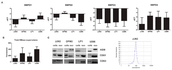 SMPD1 expression levels correlate with total SMase content in supernatant in MM cell lines and their exosomes. (A) Basal-dCT values of all four genes coding for SMases (SMPD1–4) measured by qRT-PCR in four human MM cell lines (JJN3, OPM2, LP1, and U266) after 24 h of culture. The housekeeping gene ABL1 was used for data normalization, and differential gene expression was determined using the comparative ΔΔCt method. (B) Basal total SMase content determined in supernatans by an AmplexRed SMase assay after 24 h of culture for all four cell lines. The amount of SMase activity measured in these cell lines corresponded best to SMPD1 expression, coding for acid SMase (ASM). (C) Cells and exosomes were isolated after 24 h of culture and analyzed for ASM content and exosomal markers, CD81 and CD63. Nanoparticle tracking analysis by Zetaview analysis shows a mean diameter of 50–150 nm, confirming the expected size of exosomes. Immunoblot can be found in Supplementary Figure S4B. ASM = acid sphingomyelinase, exo = exosomes. In A and B, the averages of n > 3 are shown.
