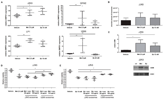 First, we determined whether ASM expression was increased in response to drug treatment. We focused on the effects of melphalan (Mel) and bortezomib (Bz) treatment on ASM expression, both in HMCL and their exosomes. HMCL were treated with low doses of melphalan and bortezomib in medium without serum. After 24 h, the expression level of SMPD1 was measured by qRT-PCR (Figure 3A). OPM2 and U266 cells increased their ASM expression in response to melphalan treatment four-fold, while JJN3 and LP1 cells had a smaller but still significant response in ASM expression to melphalan. Treatment with bortezomib induced a significantly higher ASM expression in the JJN3 cells while there was a slight increase in LP1 and OPM2 cells.