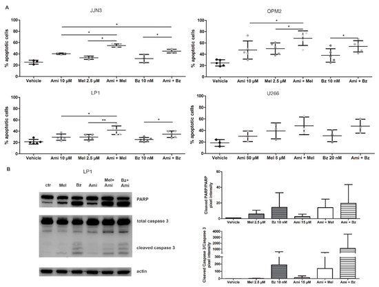 Amitriptyline, an acid SMase inhibitor, increases the drug efficacy of melphalan and bortezomib in MM cell lines by inhibiting ASM and inducing apoptotic cell death. (A) JJN3, OPM2, LP1, and U266 were treated with melphalan, bortezomib, and/or amitriptyline. After 24 h of culture, apoptotic cell levels were measured by flow cytometry with staining for 7-AAD and annexin V-FITC. (B) LP1 cells were treated with melphalan, bortezomib, and amitriptyline. After 24 h, cell lysates were isolated, and (cleaved) PARP and caspase 3 levels were verified and quantified by Western blot analysis. Non-significant effects were observed. Immunoblot can be found in Supplementary Figure S4D. Ctrl = control, Ami = amitriptyline, Mel = melphalan, Bz = bortezomib. p < 0.05 (*), and p < 0.01 (**) were considered statistically significant. The averages of n > 3 are shown.