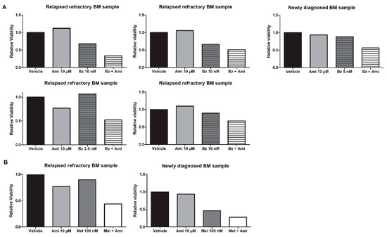 Finally, we confirmed the efficacy of the combination of amitriptyline and bortezomib or melphalan in primary cells obtained from the bone marrow of relapsed/refractory MM patients. We isolated the CD138+ fraction from bone marrow samples, treated them immediately with varying doses of Bz (n = 5) and Mel (n = 2), and added amitriptyline as a single agent (10 µM) or in combination with either Bz or Mel. When using low doses of either drug, we observed an increased drug effect of 24% to 50%, depending on the patient sample, by adding amitriptyline (Figure 5A,B).