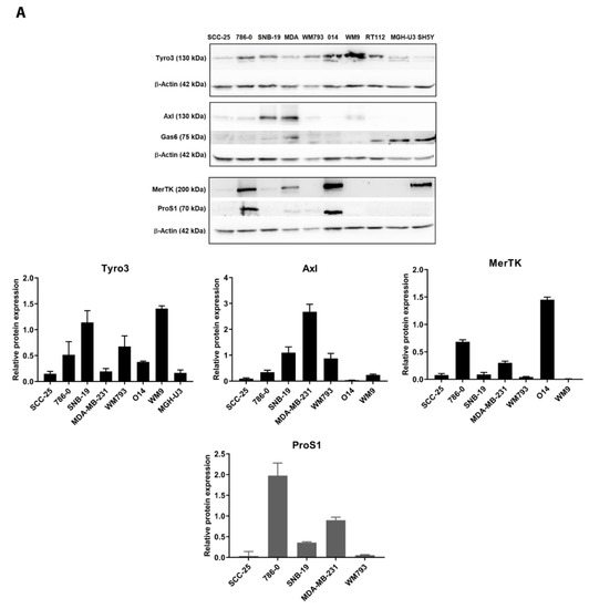 Western blot screening of TAM receptors and ligands was performed on protein extracts from 10 cell lines from a variety human cancers (cell line list in Supplementary Table S1). At protein level, Tyro3 was the most ubiquitously expressed of the three TAM receptors in the cancer cell lines tested (Figure 1). Quantitation from multiple Western blot results showed the expression of Tyro3 to be highest in melanoma, glioma and kidney cancer cells (Figure 1A). In comparison, the expression profiles of the other TAM receptors Axl and MerTK were more discrete, with strong expression of Axl observed in breast cancer and glioma cells, whilst MerTK was most highly expressed in melanoma and kidney cancer cells. With the TAM ligands, ProS1 was found to be expressed highly in 786-0 kidney cancer cells and in one melanoma cell line (Figure 1A).