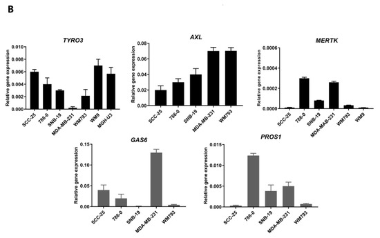 2.1. Expression of TAM Receptors and TAM Ligands in Human Cancer Cell Lines