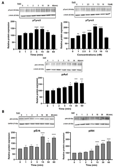 Effect of ProS1 and Gas6 stimulation on phosphorylation of TAM receptors and intracellular signalling kinases in SCC-25 cells. (A) Representative Western blots showing phosphorylated Tyro3 (pTyro3) protein in SCC-25 cells stimulated by ProS1 (7.5 nM) in time-course and dose response experiments, and phosphorylated Axl (pAxl) protein in cells stimulated over a time-course by Gas6 (5.7 nM). (B) Representative Western blot images show time-course of Erk phosphorylation (pErk) and Akt phosphorylation (pAkt). Accompanying graphs show protein quantification by densitometric analysis of bands. Data are mean ± SEM protein expression normalized against GAPDH or β-actin as loading control protein; ANOVA with Tukey’s multiple comparison post-hoc analysis; **** p < 0.0001, *** p < 0.001, ** p < 0.01, * p < 0.05, versus control (time 0 or untreated) (n = three separate experiments).