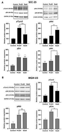 The following are available online at https://www.mdpi.com/2072-6694/11/12/1843/s1, Figure S1: Effect of ProS1 and Gas6 stimulation on Tyro3 phosphorylation and signalling in six human cancer cell lines; Figure S2. Effect of ProS1 and Gas6 stimulation on Axl phosphorylation and signalling in three human cancer cell lines; Figure S3. Representative dot plot diagrams obtained by flow cytometry with Annexin V-FITC/PI double-staining of SCC-25 (A) and MGH-U3 (B) cells; Figure S4. Confirmation that staurosporine does not inhibit Tyro3 kinase activity and its activation by TAM ligands; Figure S5. MTS cell viability assay showing the anti-apoptotic influence effects of ProS1 and Gas6 to also occur when apoptosis is induced by an alternative agent, cisplatin; Figure S6. MTS cell viability assay showing that blockade of Erk signalling prevents the anti-apoptotic effect of ProS1; Figure S7. Verification of changes in levels of phosphorylated Erk (pErk) and Akt (pAkt) proteins in relation to total Erk and Akt protein levels in western blots; Table S1. Ten human cancer cell lines were analysed for expression of the TAM receptors and their ligands Gas6 and ProS1; Table S2: Primers used in qRT-PCR; Whole blot figures.