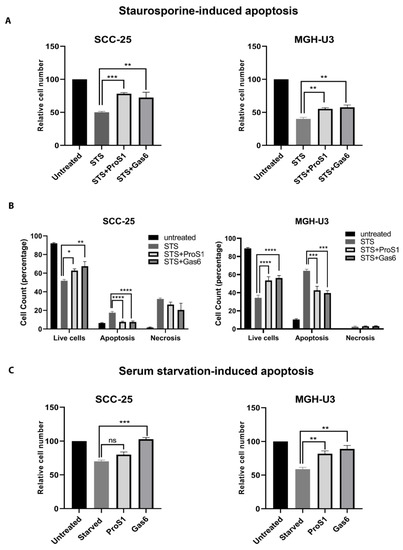 Having determined the receptor and signal pathway activation profile of ProS1 as a vitamin K-dependent TAM ligand, we investigated the functional effect of ProS1 on cells undergoing apoptosis under acute and prolonged conditions. In MTS assays, staurosporine (0.1 µM) was used to acutely trigger apoptosis, and the effects of TAM ligands on this was measured over 20 h. Under these conditions, both ProS1 and Gas6 significantly protected cells from apoptosis in both SCC-25 (Tyro3 and Axl) and MGH-U3 (Tyro3 only) cancer cell lines (Figure 5A). We confirmed that the staurosporine at 0.1 µM did not block Tyro3 activity in cells, nor did it prevent Tyro3 activation by ProS1 in it presence (Supplementary Figure S4). Flow cytometry experiments also revealed the protective effect of both ligands Gas6 and ProS1 on staurosporine-induced acute apoptosis (Figure 5B), where presence of the ligands reduced the percentage of cells undergoing apoptosis as compared to cells treated with staurosporine alone (Figure 5B and Supplementary Figure S3). We also observed the same protective effects of ProS1 and Gas6 on viability of both cancer cells lines using an alternative apoptosis-inducing agent, cisplatin (Supplementary Figure S5). Furthermore, under conditions of long-term serum starvation, Gas6 significantly conferred a survival effect in both cell lines, whereas ProS1 significantly protected only the MGH-U3 cells (express Tyro3 only) (Figure 5C).