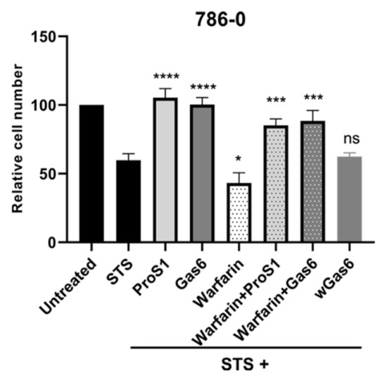 MTS assay showing the influence of vitamin K antagonism by warfarin on growth/viability of 786-0 (ProS1-producing) cells. Apoptosis was induced in 786-0 cells by staurosporine (0.1 µM), and the effects of co-incubation with exogenous TAM ligands over 20 h was measured, both in cells pre-treated or not with warfarin for 48 h. wGas6 is a fully uncarboxylated Gas6 protein used as the negative control for the vitamin K-dependence of the functionality of Gas6. Data are mean±SEM; ANOVA with Tukey’s multiple comparison post-hoc analysis; **** p < 0.0001, *** p < 0.001, * p < 0.05 and ns, not significant, versus staurosporine (STS) (n = three separate experiments).